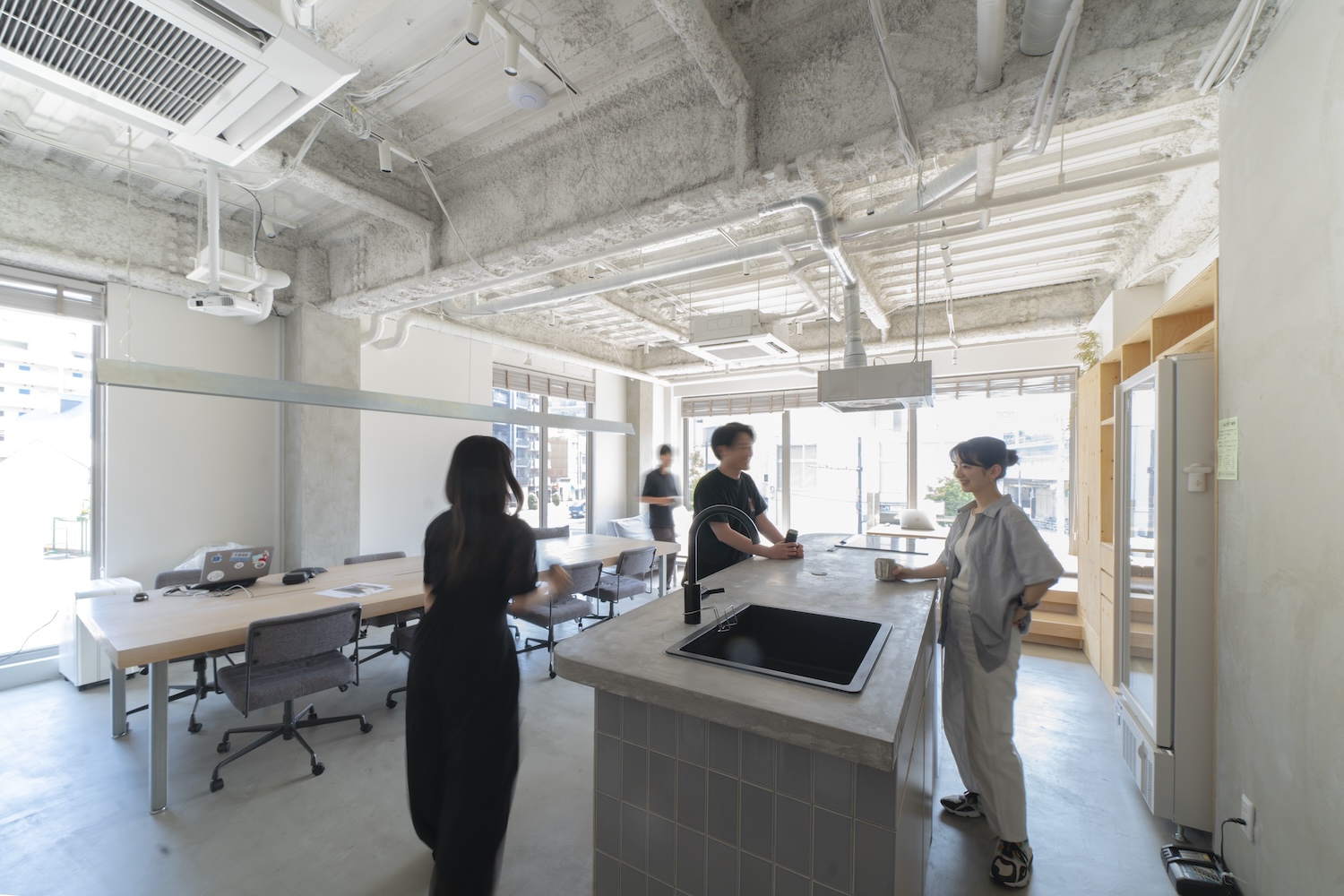 カウンターには自然と人が集まり、コーヒー片手に談笑がはじまる――オフィスに居ながら“家のような安心感”を感じられる空間になっています。