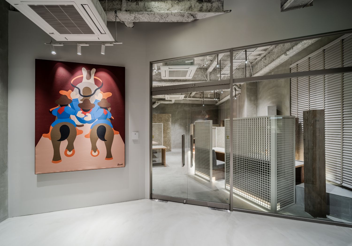 新オフィスのエントランスには、当初の「ギャラリー」という案を活かして会社の理念をビジュアル化したイラストを掲示。イラストはイラストレーターさんに描き下ろしていただきました。奥は作業スペースになっています。