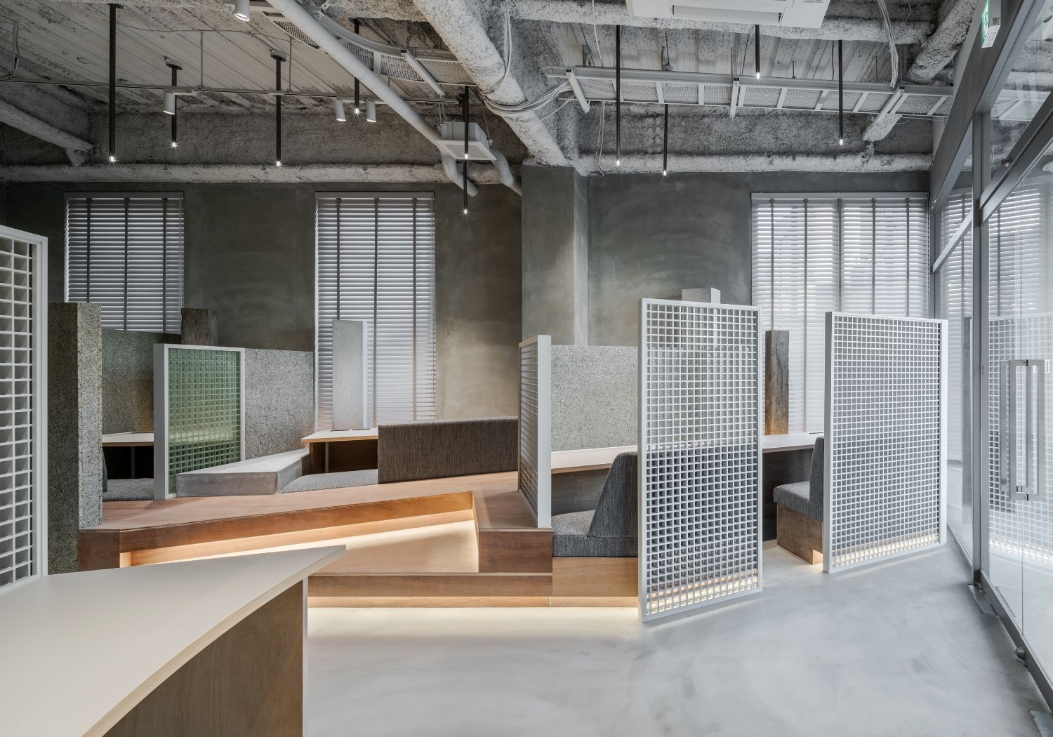 工場などで使用される格子状の「グレーチング」を仕切り壁に採用。プライベートスペースは確保しつつ、近くにいる人の気配をうっすらと感じながら作業することができます。
