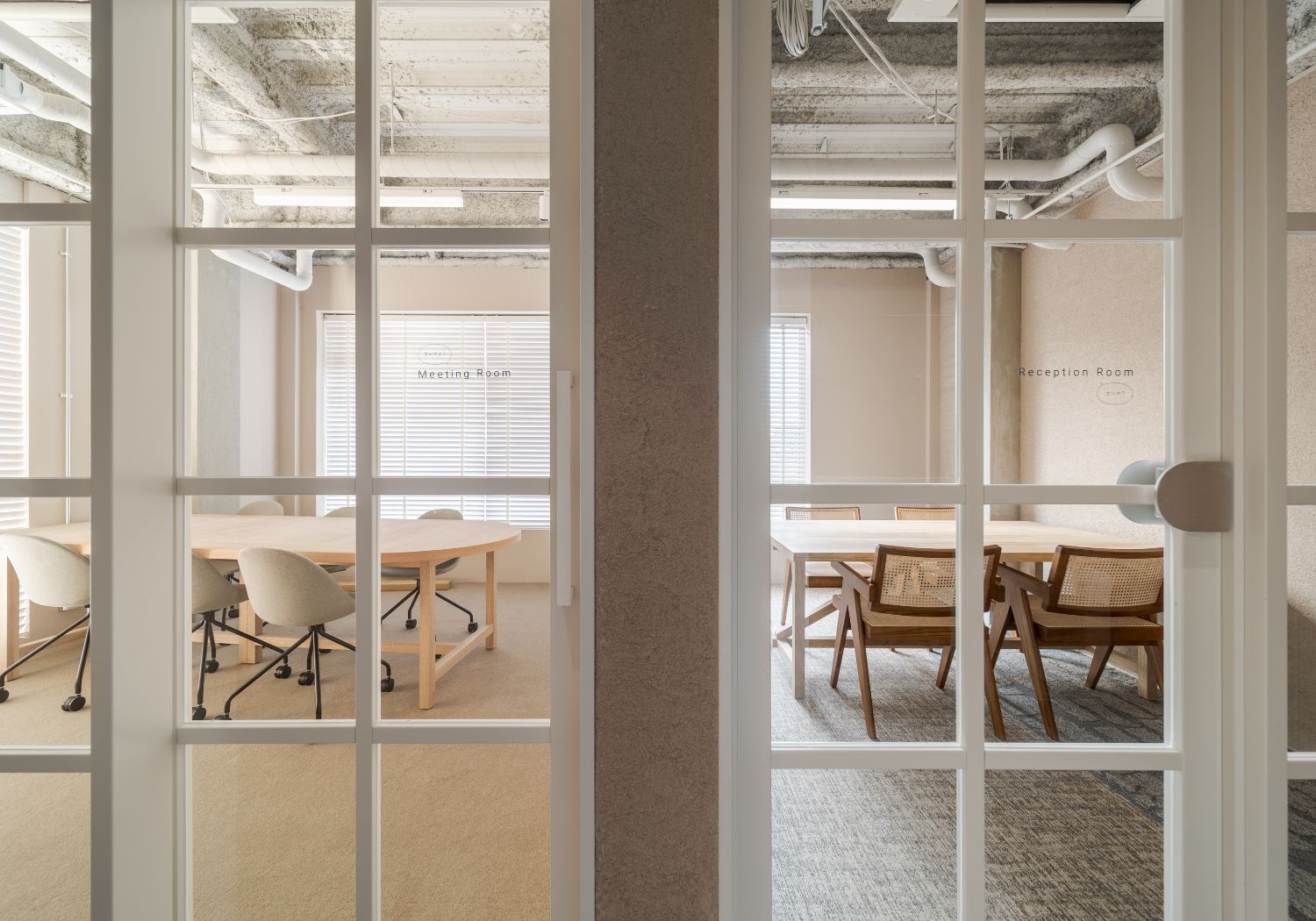 右が応接室で、左が会議室(ともに3階)。廊下から撮影したのでひとつの空間に見えますが、実際には別々の部屋に分かれています。